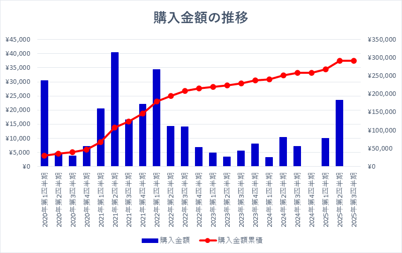 年間5万円分くらいを購入しているので、1か月あたり1~2銘柄くらいを適当に購入していますが、日経平均が4万円を超えている期間はできるだけ避けてます。