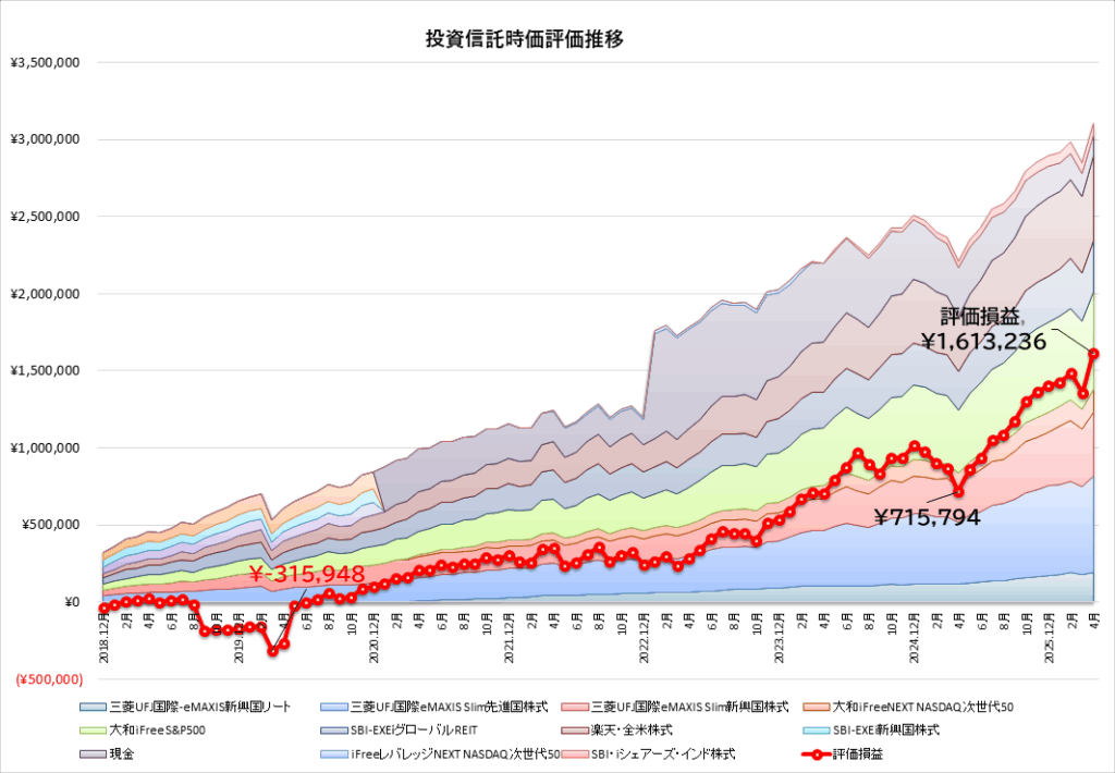 | 新NISA積立枠 | 三菱UFJ国際-eMAXIS Slim新興国株式 | ¥416,715 | ¥196,000 | ¥220,715 | 212.6% |